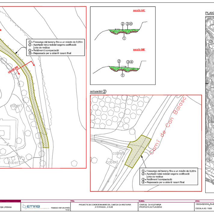 - Delimitació de camins. Moviment de terres per a la construcció de feixes amb gabions.